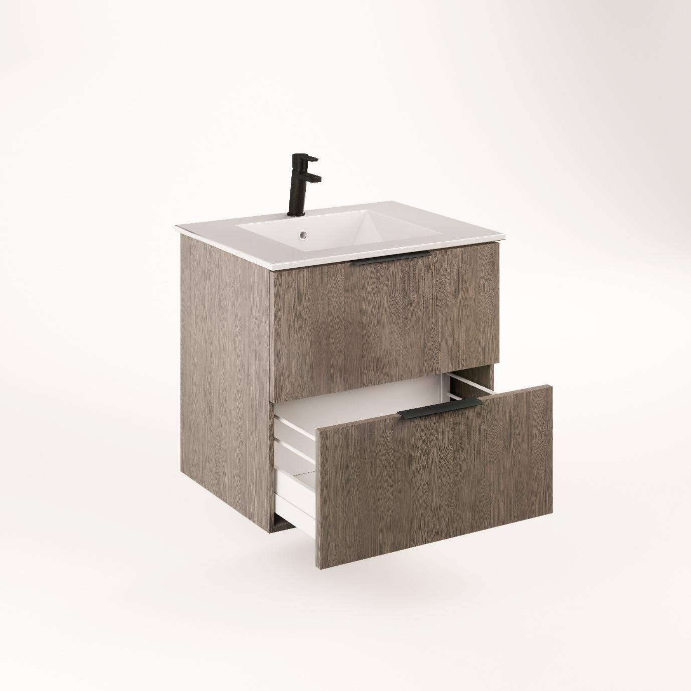 Medžio imitacija | Balti arba pilki baldai | Keraminis praustuvas, chromuotas maišytuvas |