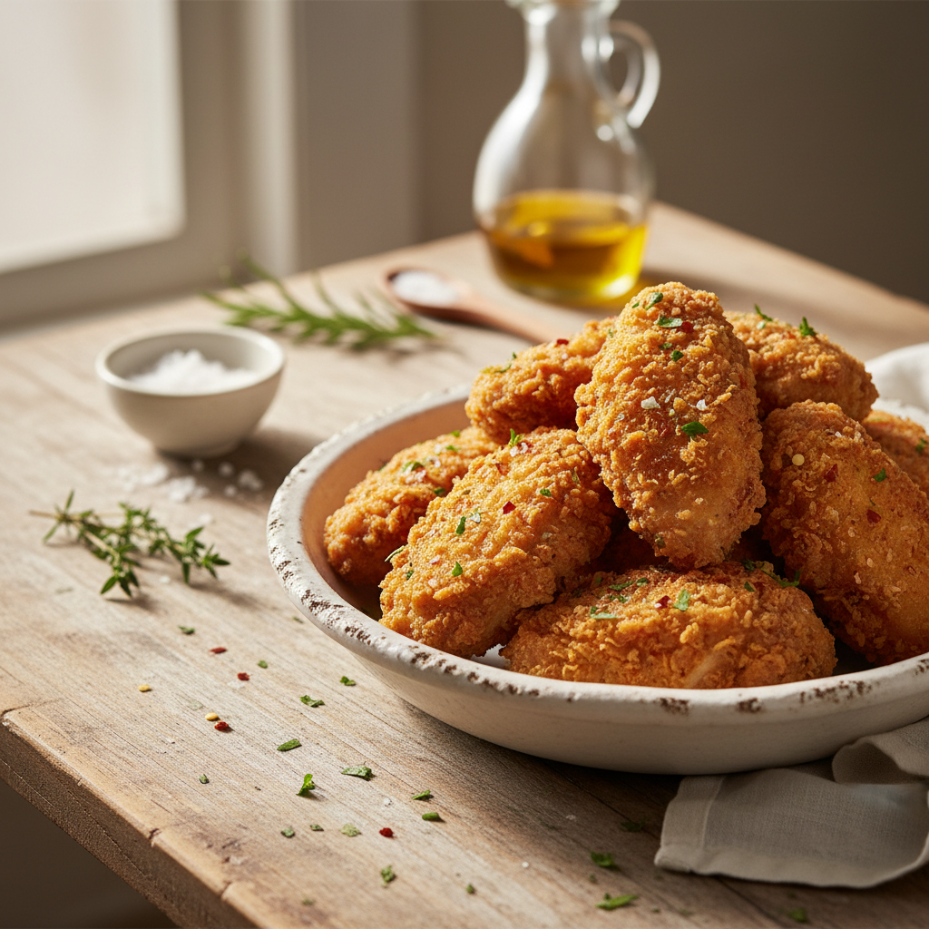 Klasikinės traškios vištienos receptui reikės kelių paprastų, bet svarbių ingredientų. Svarbiausia – pasirinkti šviežią vištieną ir tinkamai pasiruošti panirimo masę.