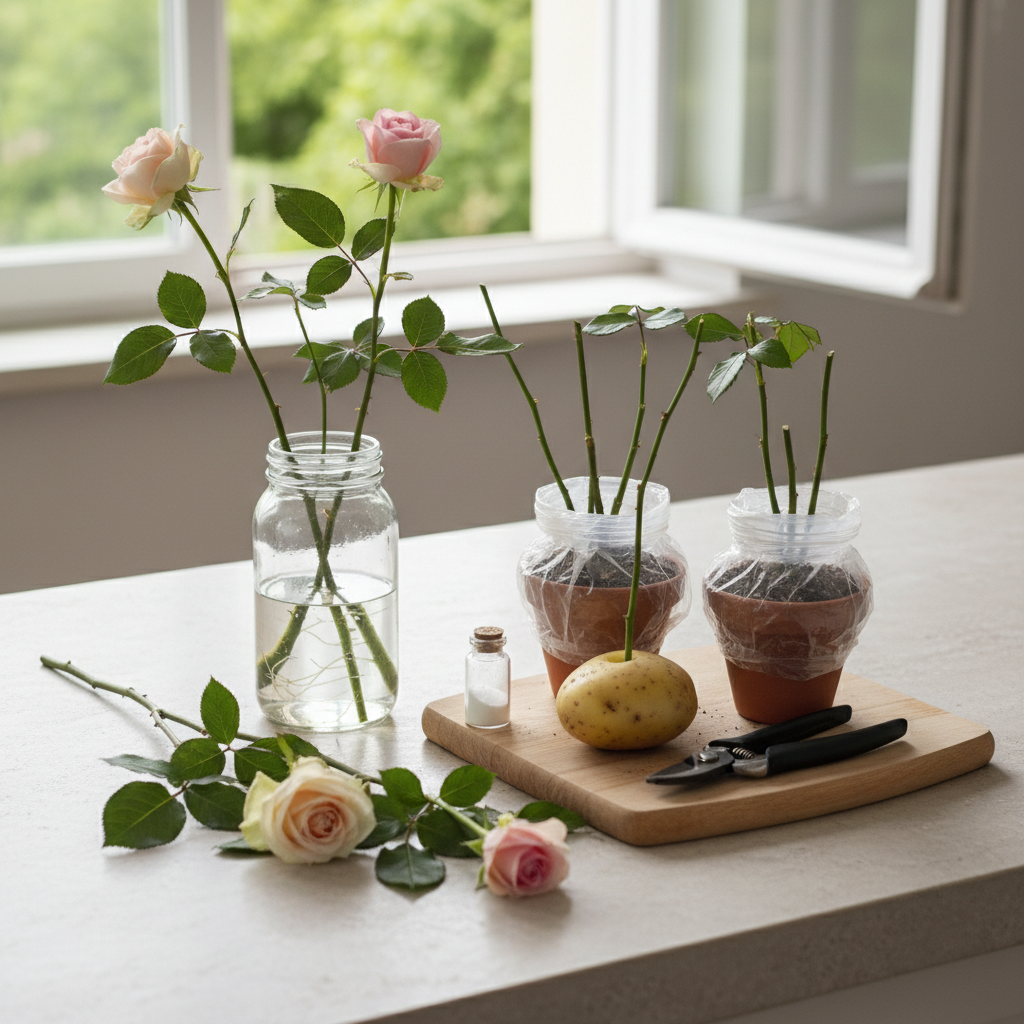 Nors skamba neįprastai, tai veiksmingas būdas dauginant rožes namuose. Kotelio apačia įstatoma į žalią bulvę, kuri vėliau sodinama į drėgną dirvą. Bulvė suteikia drėgmės ir maistinių medžiagų, padedančių koteliui greičiau išleisti šakneles. Šis metodas ypač tinka, kai oras sausas ir sunku palaikyti pastovią drėgmę.