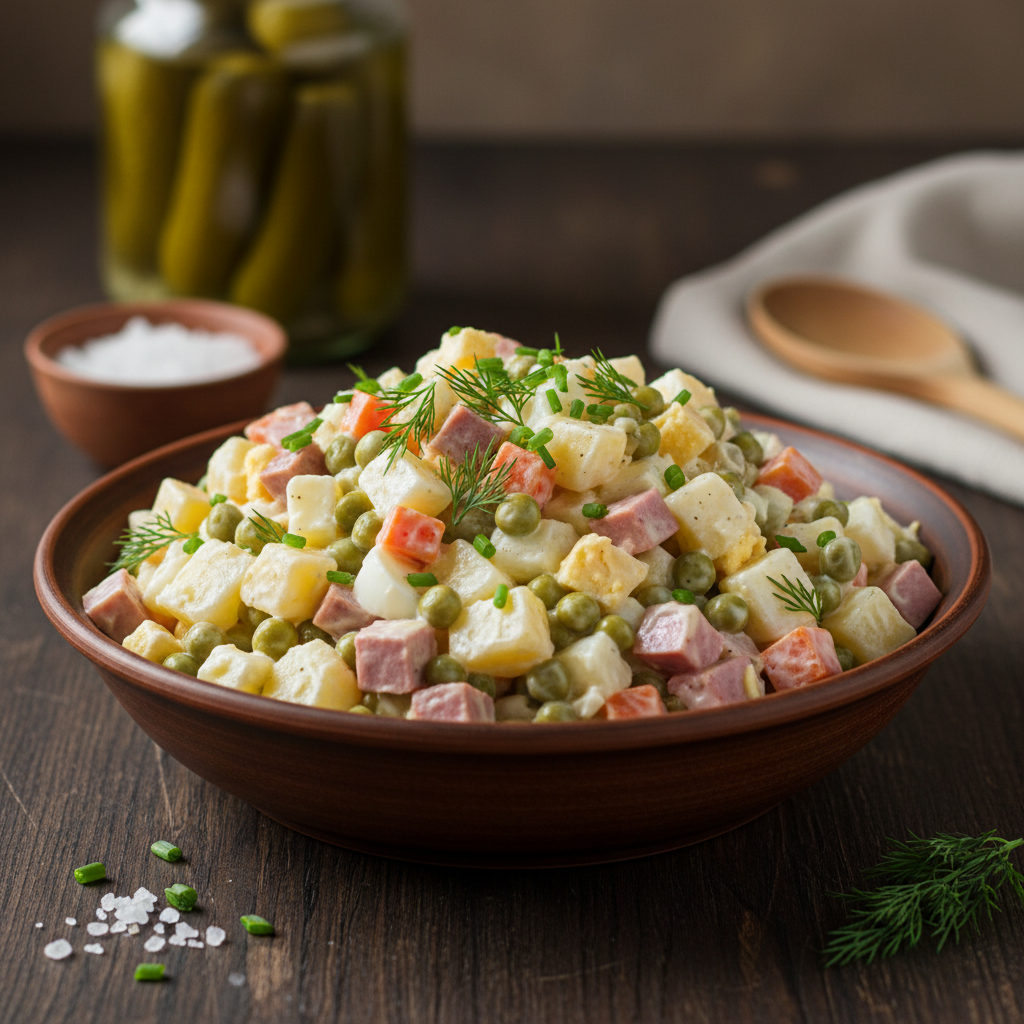 - Grietinė (nebūtina): Jei norite lengvesnės versijos, galite majonezą maišyti su riebia grietine santykiu 50/50, tačiau klasikinis receptas reikalauja gryno majonezo skonio.