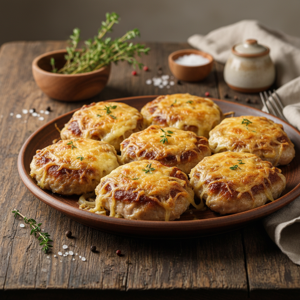 Orkaitę įkaitinkite iki 180–190°C (režimas viršus-apačia, be ventiliatoriaus, kad neišdžiovintumėte sūrio per anksti). Kepkite apie 35–45 minutes. Tikslus laikas priklauso nuo jūsų orkaitės ir kepsnių storio. Stebėkite sūrį – jis turi išsilydyti ir gražiai apskrusti, tapti auksinės spalvos. Svarbu neperkepti: vos tik sūris gražiai apskrunda, o mėsa išskiria skaidrias sultis, patiekalas paruoštas.