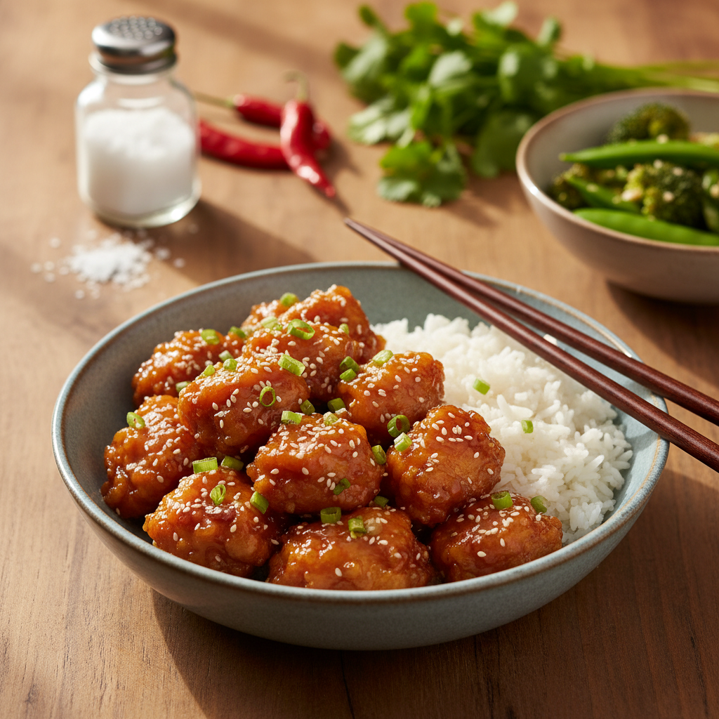 Jei kasdieniai balti ryžiai skamba per daug nuobodžiai ir norite šventiškesnės įvairovės, išbandykite keptus ryžius. Ryžius galima greitai apkepinti su kiaušiniu, žaliaisiais žirneliais, smulkintomis morkomis ir svogūnų laiškais. Taip pat puikus ir sotus pasirinkimas yra kiaušininiai makaronai, greitai apkepinti gilioje Wok keptuvėje su šiek tiek sezamų aliejaus, tamsaus sojos padažo ir česnako. Jokiu būdu nepamirškite ir daržovių, kurios suteiks gaivumo. Prie šio sodraus mėsos patiekalo itin dera lengvai apvirti ir traškūs brokoliai, žaliosios šparaginės pupelės ar egzotiški Pak Choi kopūstai, švelniai pagardinti druska ir čili dribsniais. Prieš nešdami karštą patiekalą į stalą, vištieną gausiai pabarstykite sausoje keptuvėje skrudintomis baltomis sezamo sėklomis bei smulkiai pjaustytais šviežiais laiškiniais česnakais. Tai ne tik suteiks nuostabią, restoraną primenančią estetinę išvaizdą, bet ir papildys patiekalo tekstūrą maloniu, šviežiu traškumu. Mėgaukitės tikru ir nepamirštamu Azijos skoniu tiesiog savo namų valgomajame, nes dabar jūs žinote visas būtiniausias paslaptis, kaip tai padaryti visiškai nepriekaištingai.